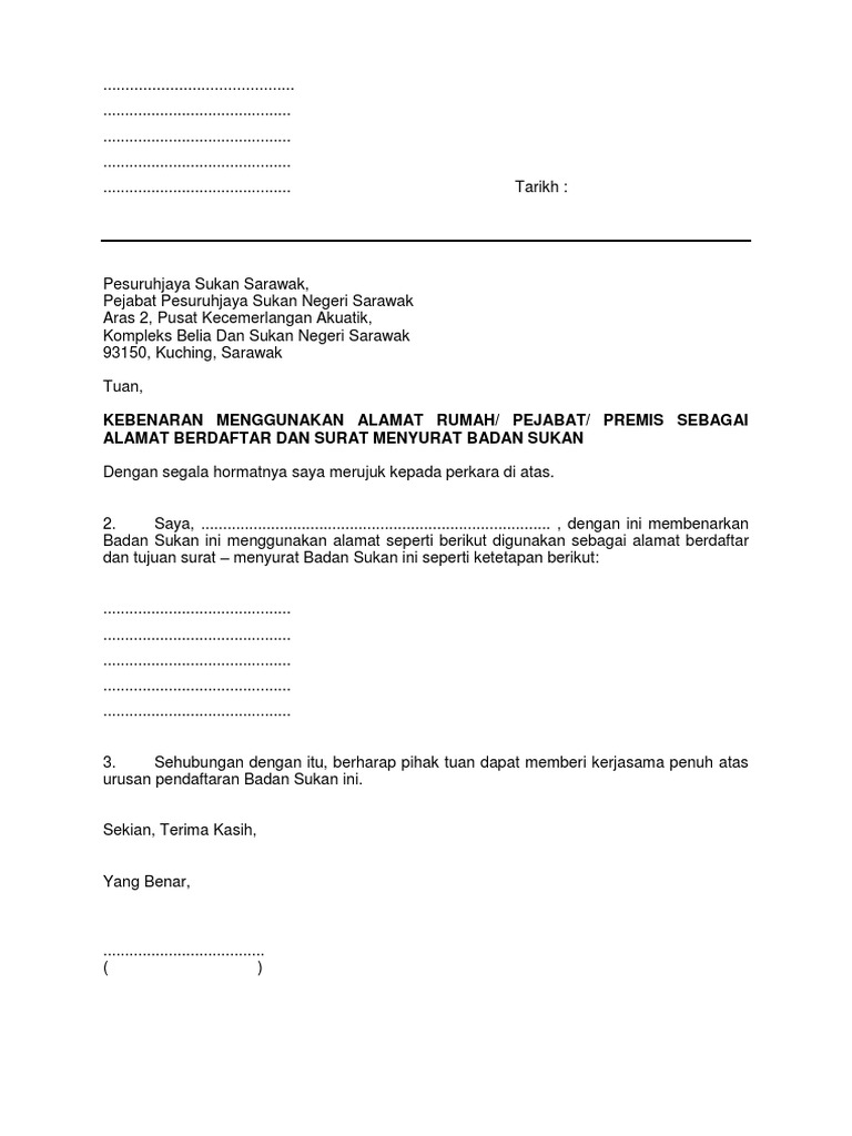 Contoh surat kebenaran menggunakan alamat kediaman sebagai alamat berdaftar kelab by muhammad_ismail_69. Pos barang ekonomi usahawan belia. Contoh surat authorised letter bahasa melayu.